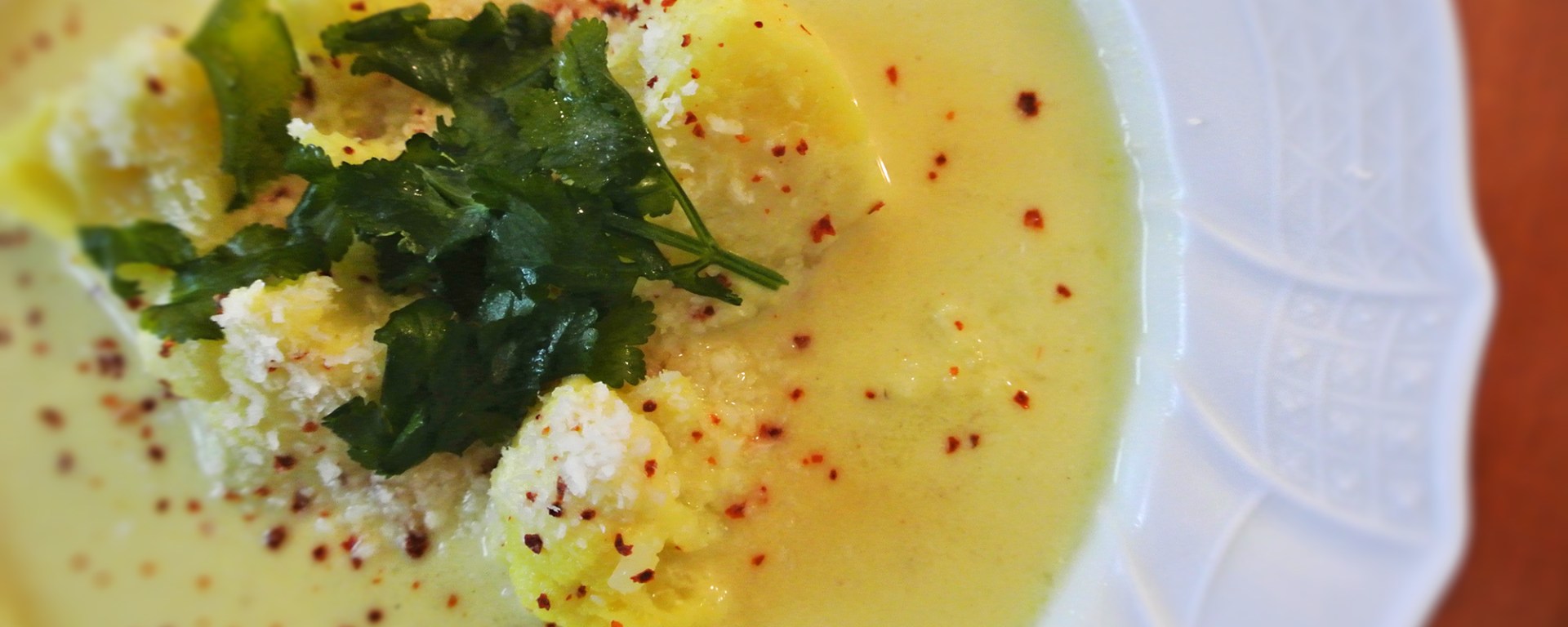 | Zutaten 1 Karfiol (Blumenkohl) 1 mittelgroße Zwiebel (oder 2 kleine) 1-2 Knoblauchzehen Ingwer nach Geschmack 2 Eßlöffel Kokosöl 200 ml Soja Cuisine oder Schlagobers 500 – 750 ml Gemüsesuppe (klar) oder Hühnersuppe Zitronenzeste & Zitronensaft Koriander, Kurkuma Kokosraspeln Salz und Pfeffer frischer Koriander oder Petersilie Chiliflocken |