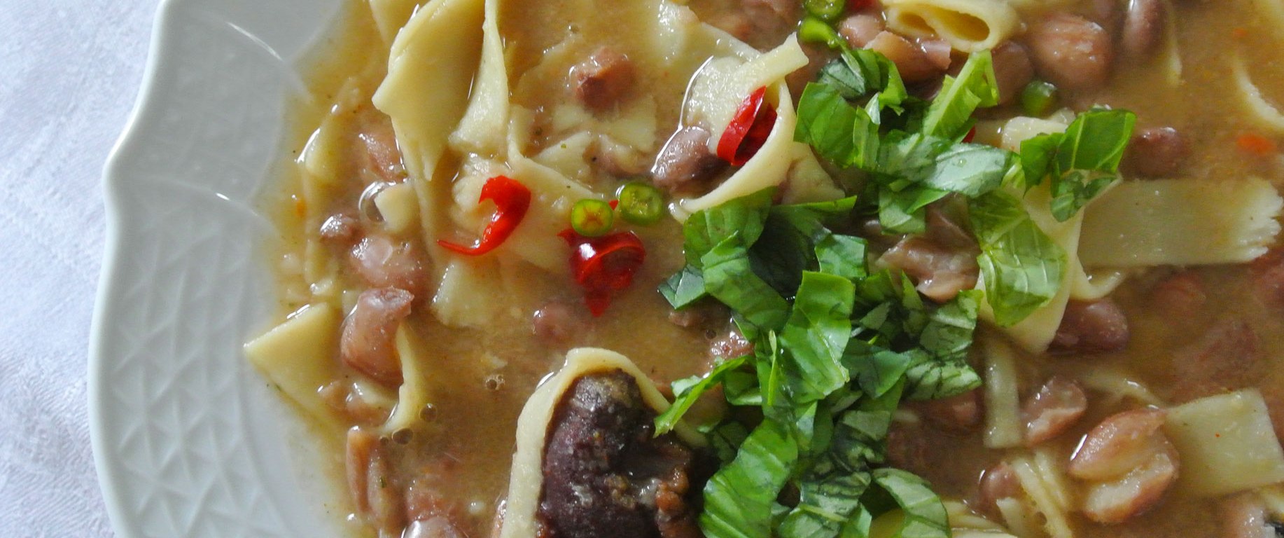 Schon meine Großmutter Theresa hat diese Suppe auf diese Art und Weise gemacht, dazu gab es immer die perfekte Pasta, dicke selbst gemachte Nudeln oder Teigvierecke, die perfekt dazu gepasst haben. Man kann sicher auch gekaufte Nudeln verwenden, aber ich finde, die selbst gemachten schmecken einfach besser! Das Rezept ist einfach und man kann eine rein vegane Variante ohne die geselchten Rippchen machen, schmeckt auch sehr gut. Man kann auf das Bohnenkraut verzichten, aber es macht das Bohnengericht bekömmlicher. Für mich gehört die Suppe jedenfalls zu den winterlichen Highlights, vor allem wenn sie richtig schön scharf ist.